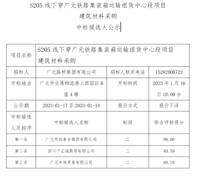 廣元路橋集團有限公司S205線下穿廣元鐵路集裝箱運輸 組貨中心段項目建筑材料采購中標(biāo)候選人公示